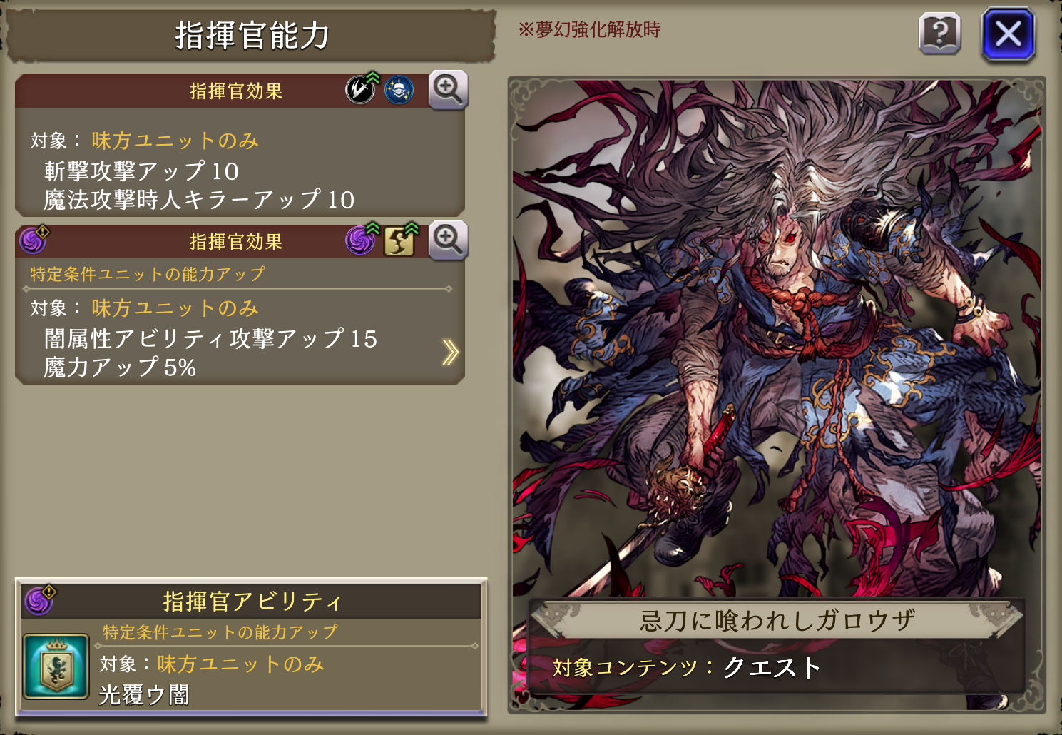| ・味方の闇属性ユニットのHP上限+10%・闇属性アビリティ攻撃+15 ・自身のリアクション阻止率+20・クリティカル率+20・範囲耐性貫通+20 |