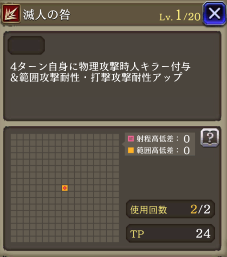 ![]() | 単体耐性60%ダウン 敵を戦闘不能にすると CT+20 沈黙係数0.25 | 1249 | |