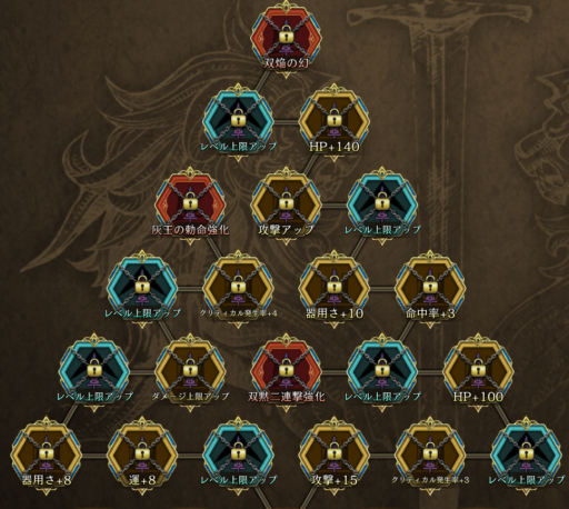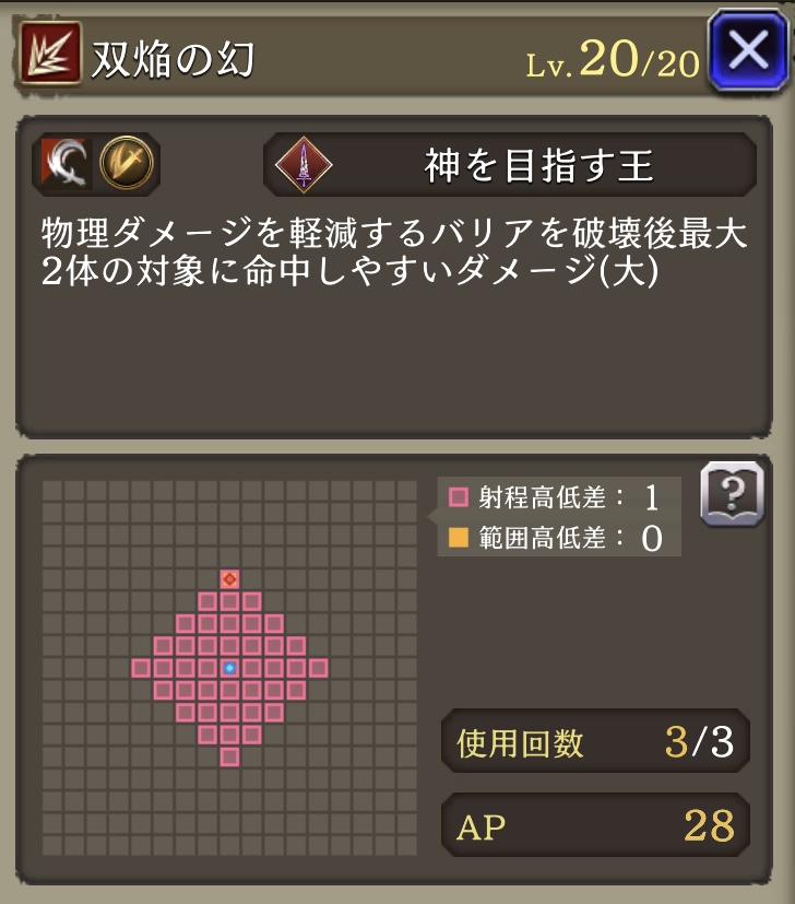弱体抵抗率+20 リアクション阻止率+30 クリティカル回避+15 双焔の幻を強化 弱体抵抗率大幅ダウン+治癒力ダウンを追加 | 物理系 アタッカー |