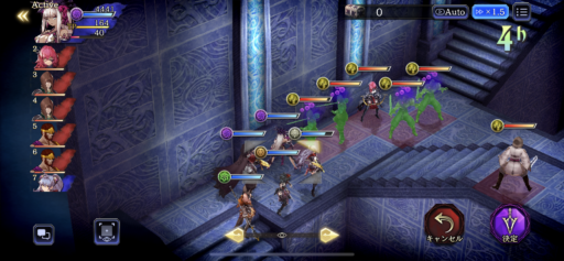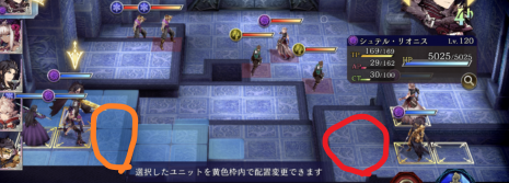 初ターンの狙い打ちなどをエルシレール・キトン・キルフェで受けるため少し前に出て他は下がります。エルシレールはダブルレジストを使い耐性を上げます。キトンは毒霧を当てて戻るかホルン兵に手裏剣で攻撃します