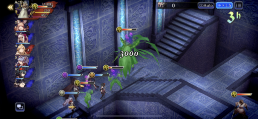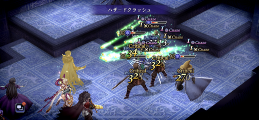 左側の「ガッツ」を使う僧兵が火力も高く危険なので、「ガッツ」を使わせる前に、エアロガ、ハザスラのチェインででまとめて倒します。