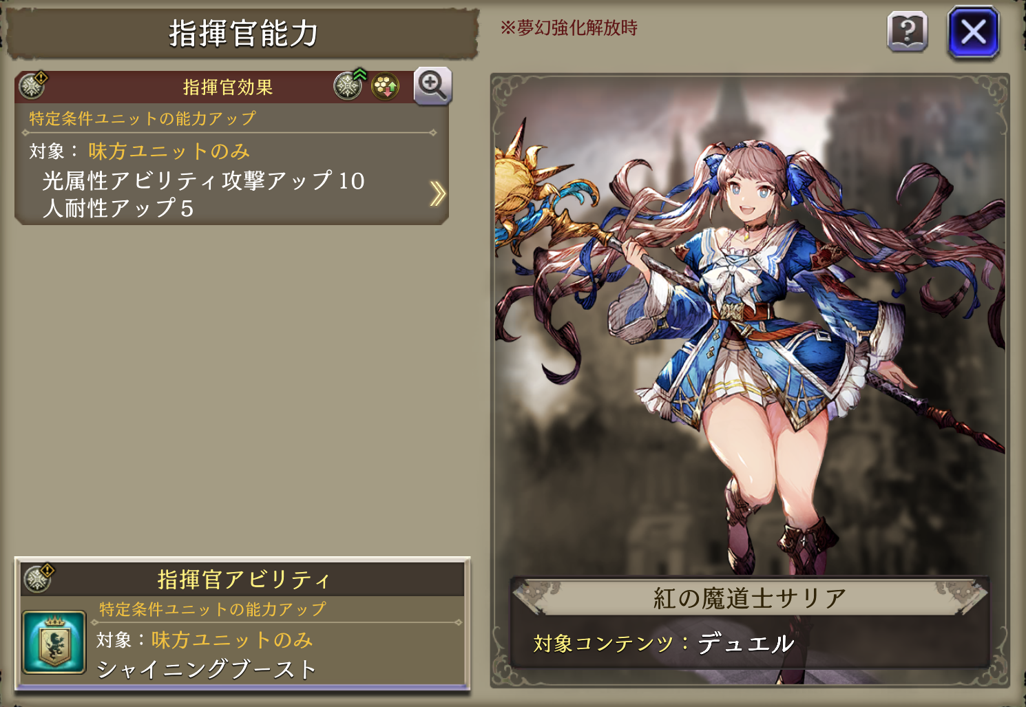 デュエル | 光 | シャイニングブースト (バトル開始時味方の)単体耐性+25、単体貫通+30、攻撃命中時光耐性25ダウン効果付与 | 48 |