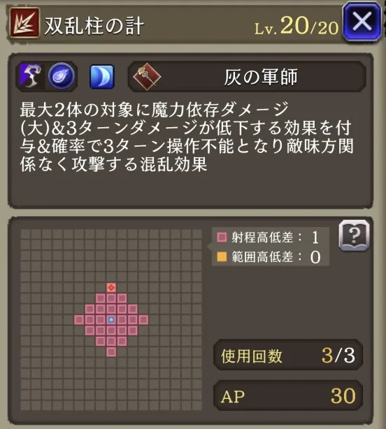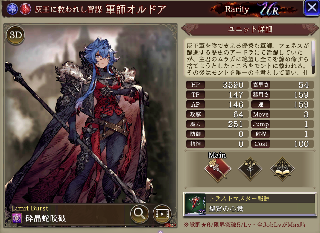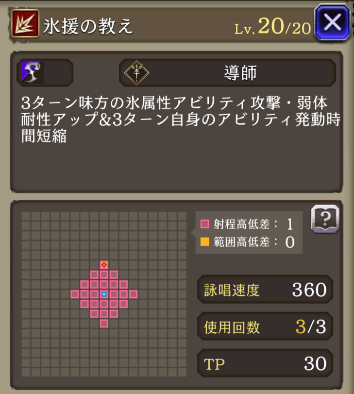 | ⇩MA3強化⇩ 味方の氷属性ユニットのHP上限+10%・氷属性アビリティ攻撃+15 自身のHP上限+30%、弱体抵抗率+15、治癒力+15、素早さ+10% 距離が遠くなる程被ダメ軽減6(距離2~5マス) |