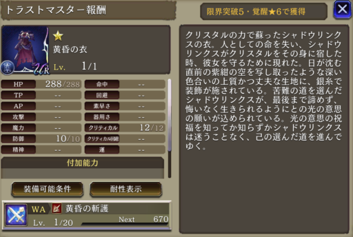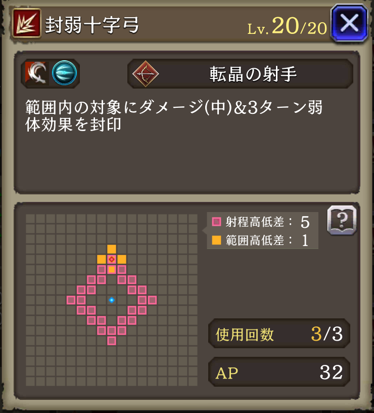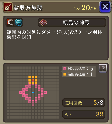 範囲耐性+15、リアクション阻止率+30 封弱方陣襲を強化 クリティカル発生時自身のAP+10回復効果追加 | 物理系 射撃 |