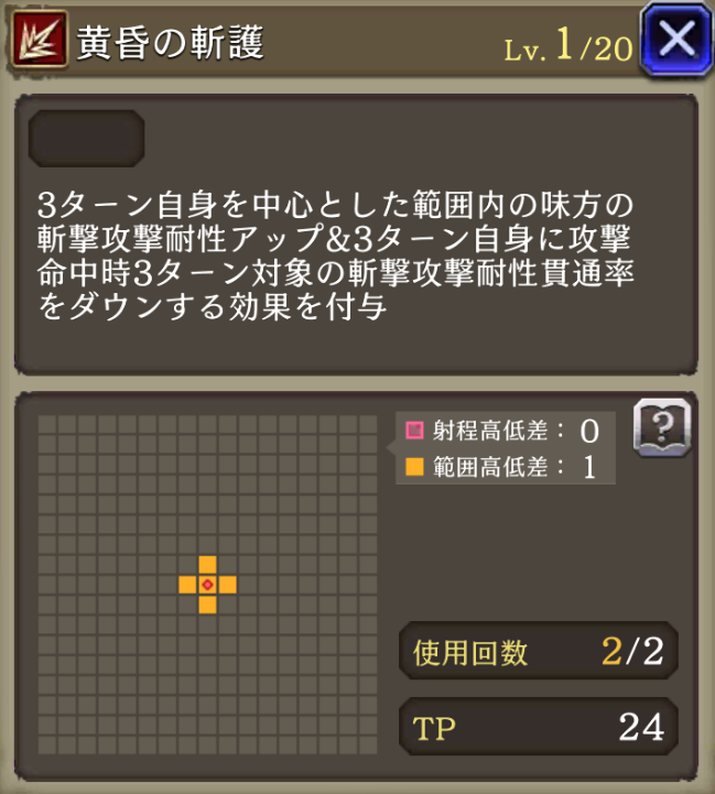 ![]() 3ターン自身を中心とした十字範囲内の対象へ斬撃耐性+25、攻撃命中時3ターン対象に斬撃耐性貫通-30する効果を付与 | 468 |