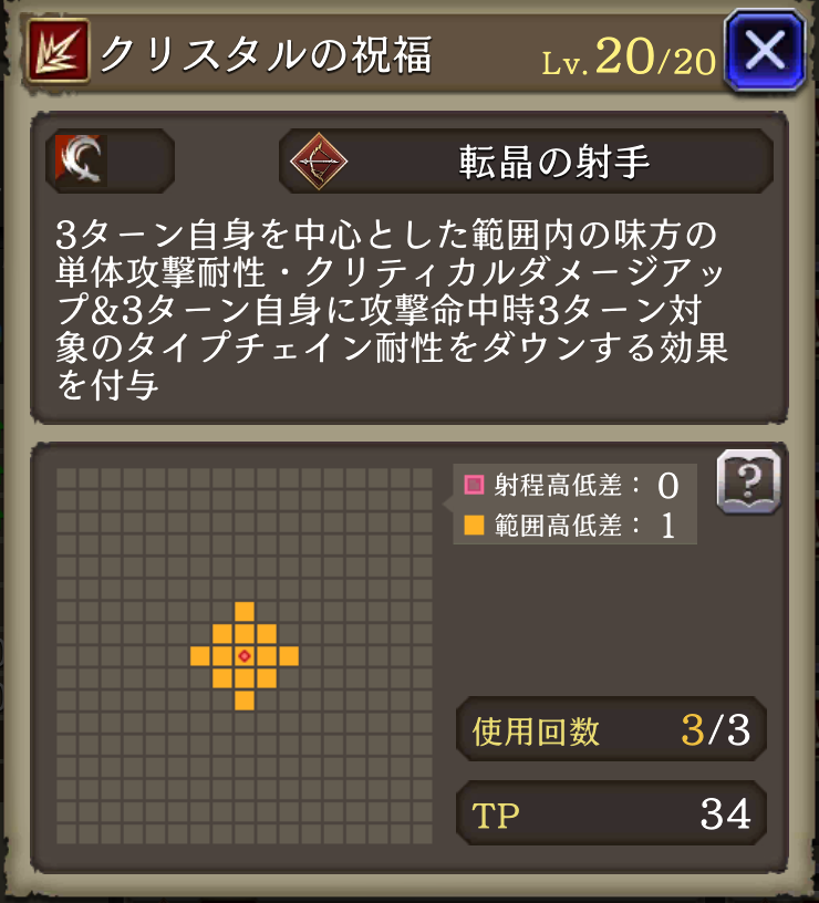![]() | 範囲内の単体耐性+20 クリティカルダメージ+20 自身に「攻撃命中時、対象の タイプチェイン耐性-30」する効果 | 1036 | |