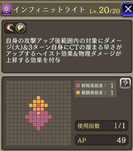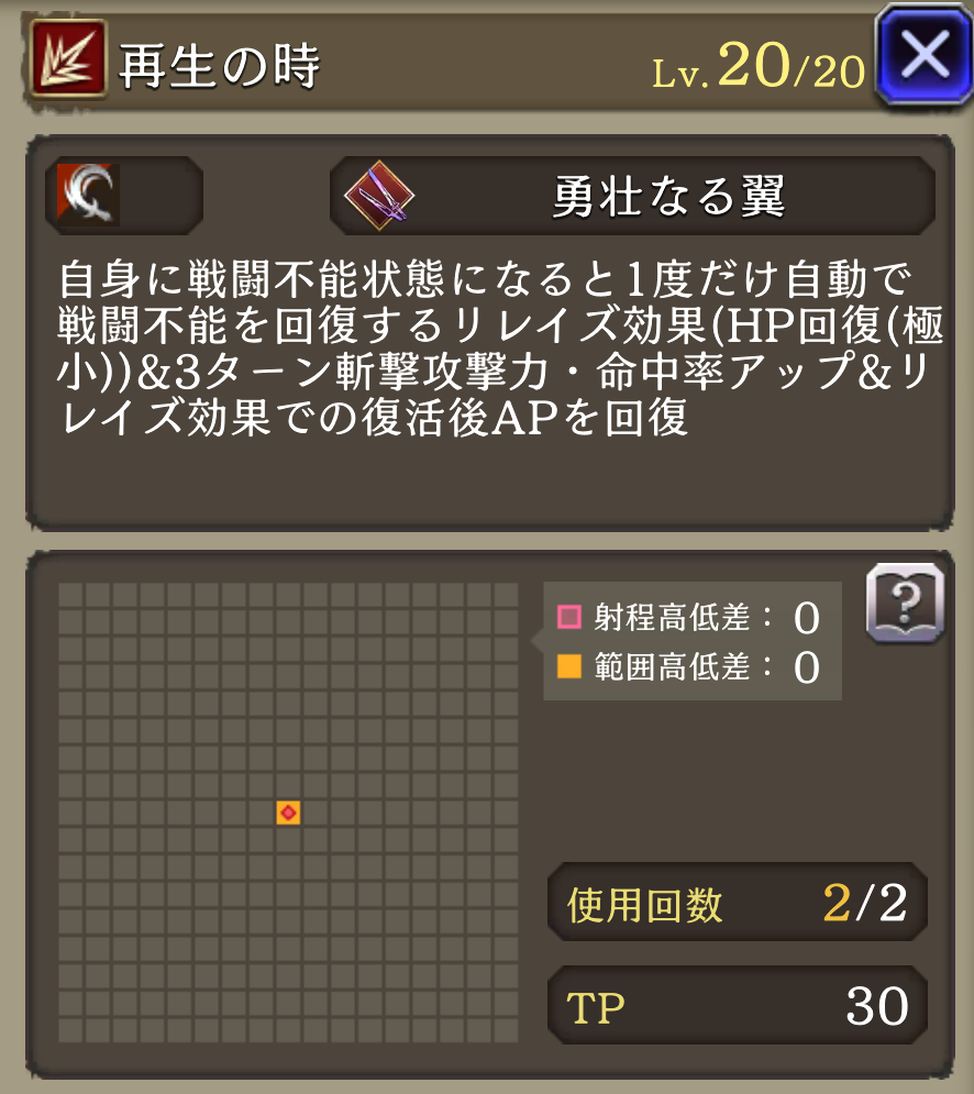 自身の攻撃+25%・消費AP-10%・リアクション阻止率+20、命中率+10・クリティカル回避率+20・斬撃耐性貫通率+20範囲耐性貫通率+20