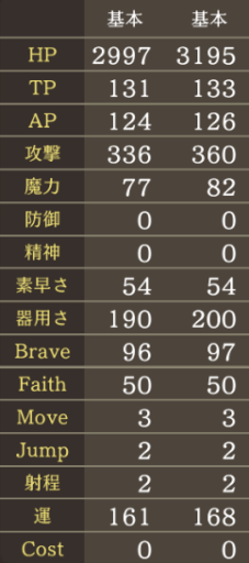 | ※装備・召喚獣・石像・マスタリー分の上昇値は含まず |