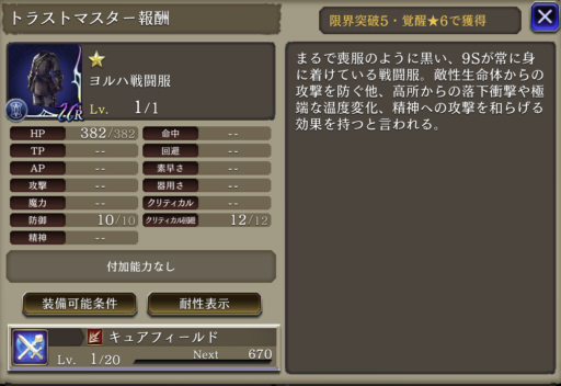 | 防御・精神+15 プロテス効果はEXで追加。 |