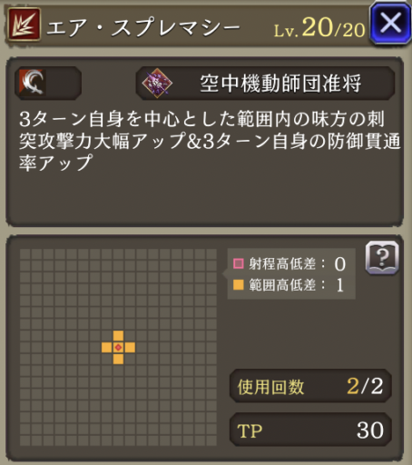 | JobLv25 エア・スプレマシー習得 | 3ターン自身を中心とした範囲内の味方の刺突攻撃力大幅アップ&3ターン自身の防御貫通率アップ |