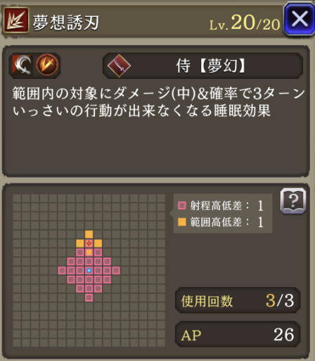 | JobLv25 夢想誘刃習得 | 範囲内の対象にダメージ(中)&確率で3ターン睡眠 |