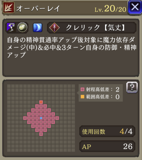| JobLv25 オーバーレイ習得 | 自身の精神貫通率アップ後対象にダメージ(中)&必中&3ターン自身の防御+15・精神+15 |