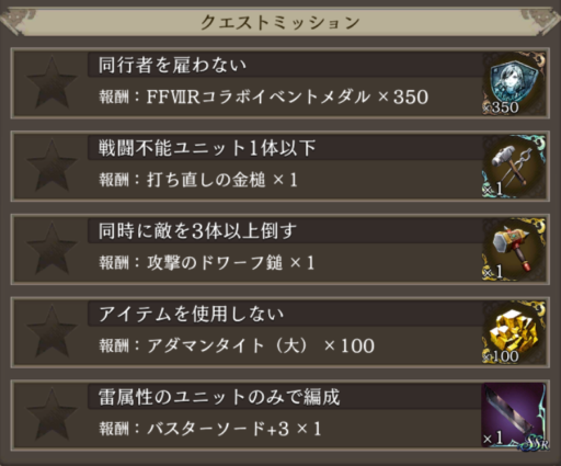 | イベントメダル | バスターソードのレシピ | 骨くず | 怪魔の翼 | 雷の結晶 | 精錬の秘伝書(大剣) | |