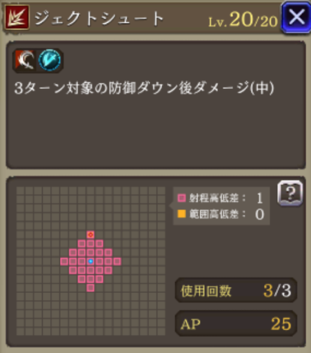 | JobLv25 ジェクトシュート習得 | 3ターン対象の防御30ダウン後ダメージ(中) |