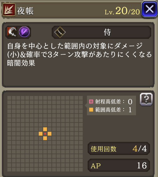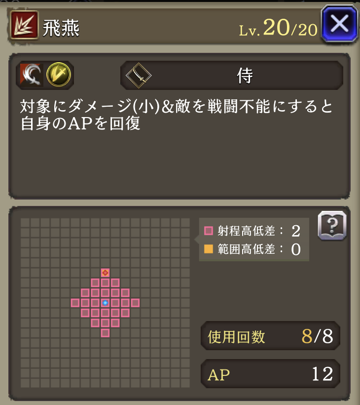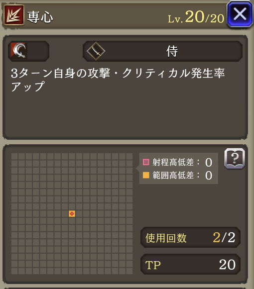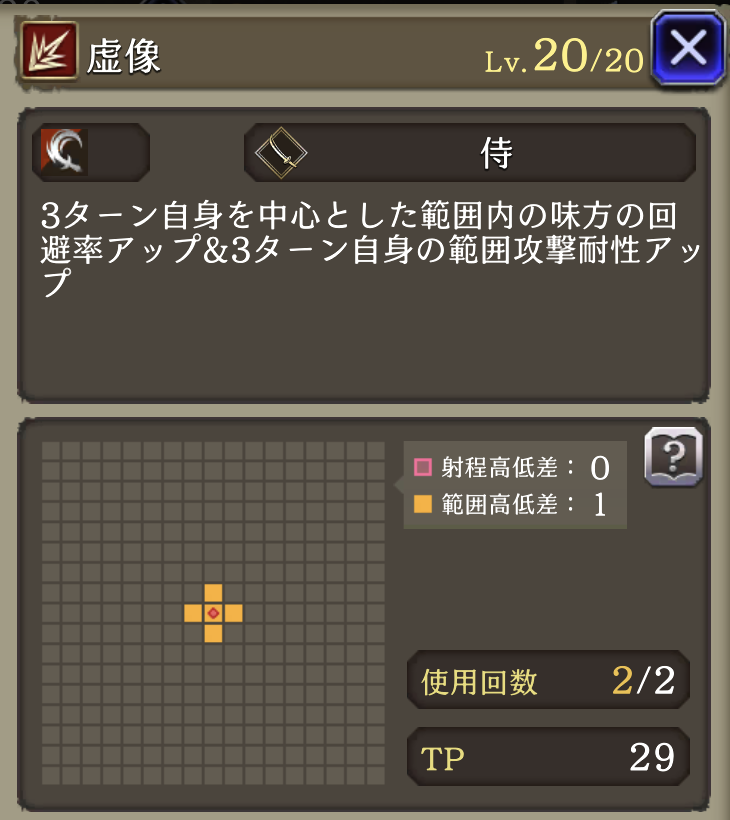 心眼 ![]() | 侍 被ダメージ時に20%の確率で3ターン自身の回避率+10(3回まで重複可) |