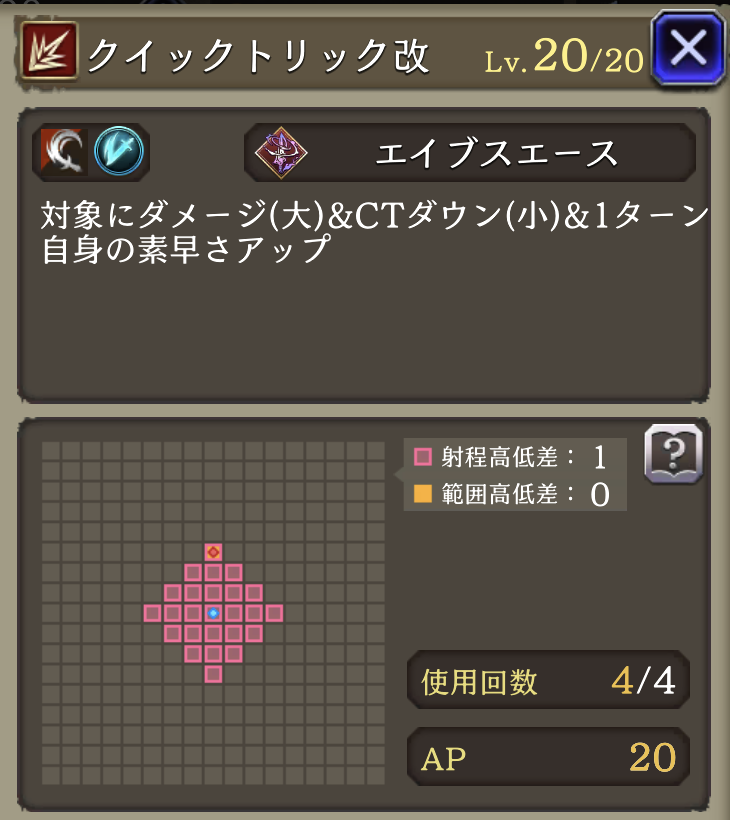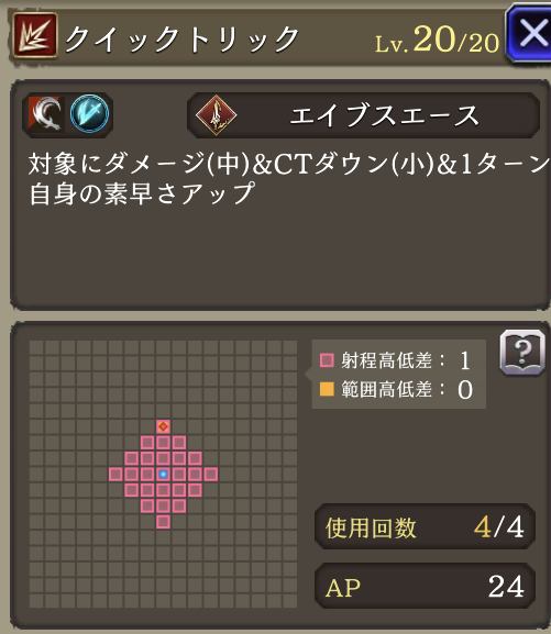 | JobLv19 クイックトリック強化 | クイックトリック改に強化 ダメージ中➜大に、消費AP24➜20へダウン |