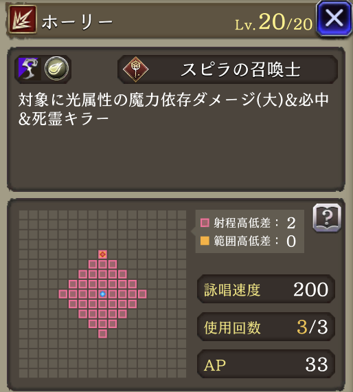 | 味方の光属性ユニットのHP上限+10%・光属性アビリティ攻撃+15、自身の範囲攻撃耐性+10、光属性アビリティ攻撃+15、アビリティ発動時間-20% |