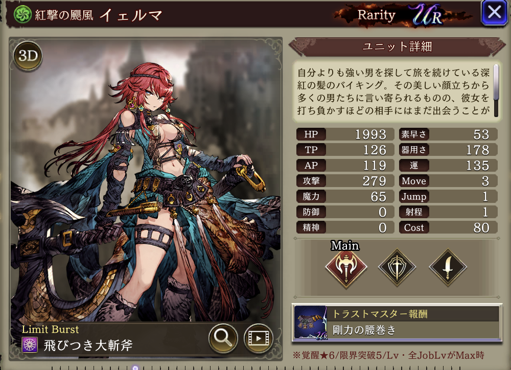 | ⇩MA3強化⇩ 味方の風属性ユニットのHP上限+10%・風属性アビリティ攻撃+15 自身の防御貫通+40、物理被ダメ軽減貫通+15、クリティカルダメージ+30%、命中+10、LB「飛びつき大斬斧」を強化(単体耐性ダウン効果がダメージ前に発動&ガッツ効果が追加) |