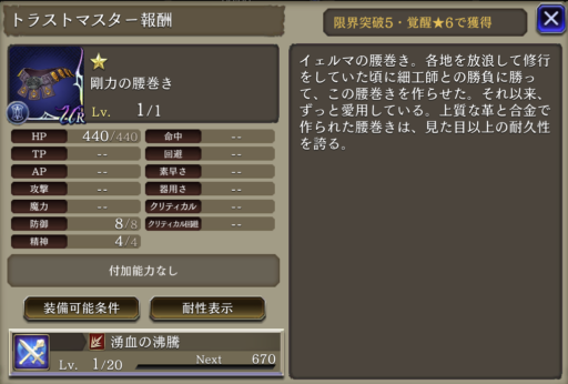 ナイトの心得 | HP上限+15%、斬撃攻撃貫通率+40 |