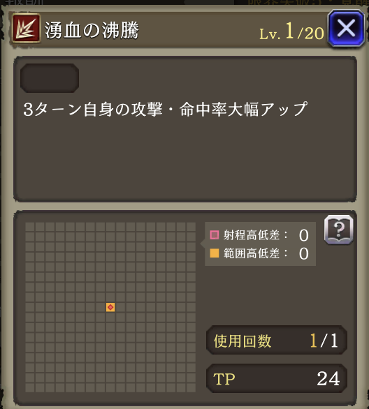 ![]() 3ターン自身の攻撃+40%・命中率+60 | 50 |