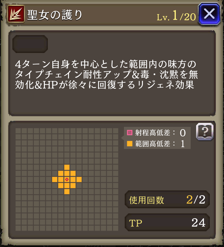 ![]() 4ターン自身を中心とした菱形範囲内の味方のタイプチェイン耐性+30、毒・沈黙を無効化、リジェネ付与 | 500 |