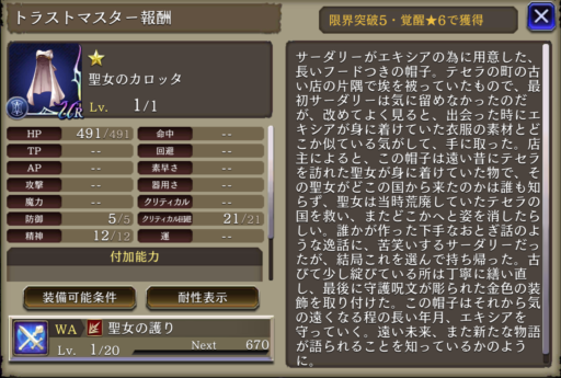 避護の衣 | 範囲耐性+15、クリティカル回避+15 |
