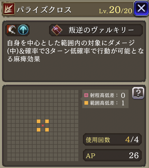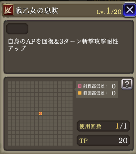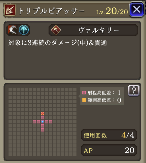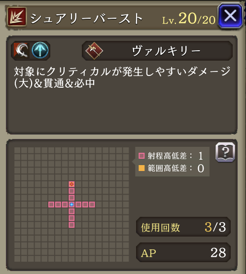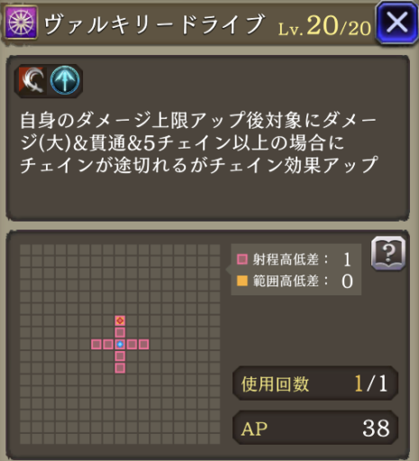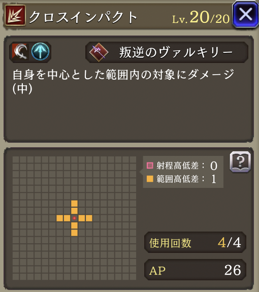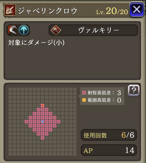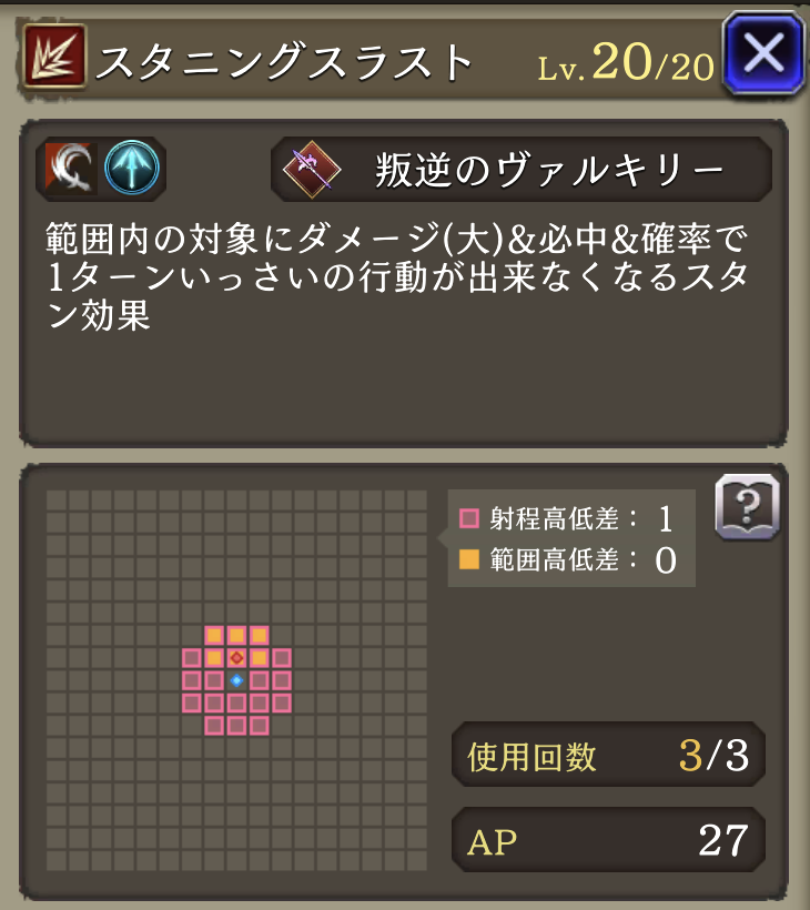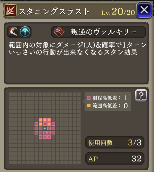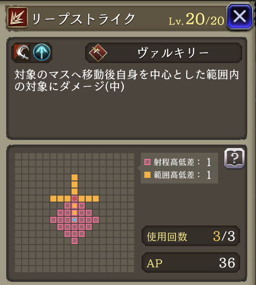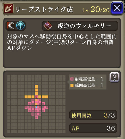 | 「リープストライク」 射程+2・消費AP36→26に 必中・全強化解除・範囲耐性貫通+40・自身のCT+40 周囲エリアデバフ:3ターン刺突耐性25ダウン |
