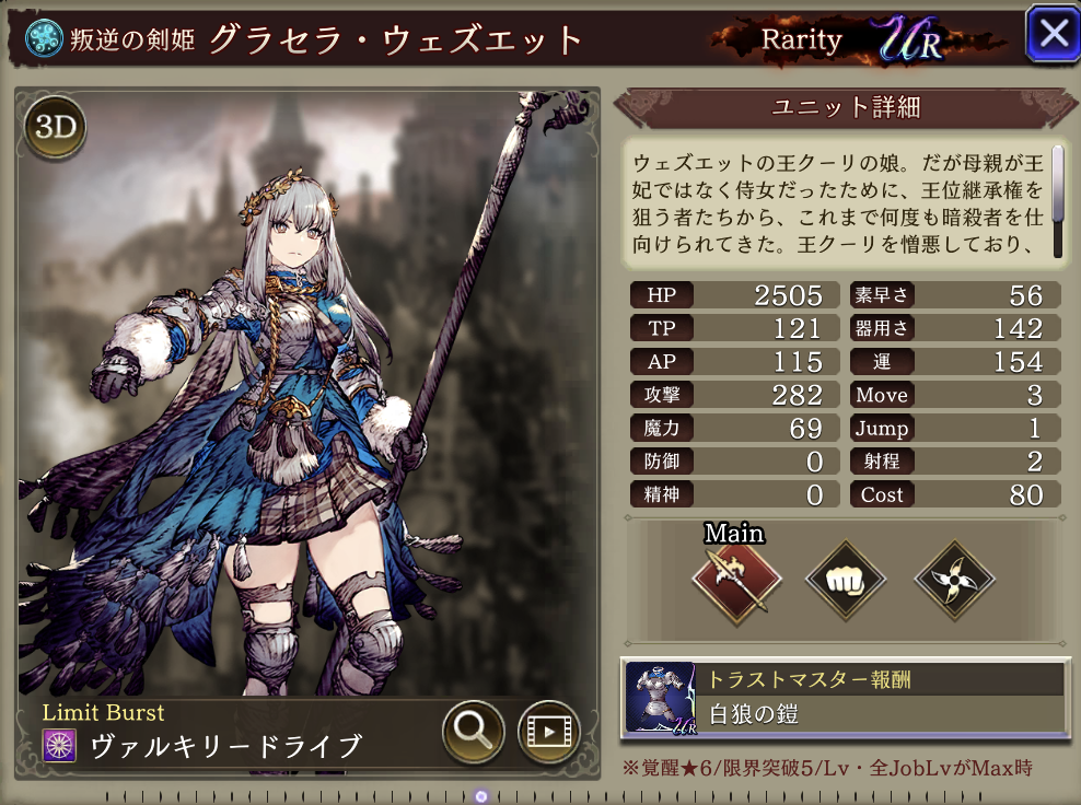 | MA3強化後⇩ 味方の水属性ユニットのHP上限+10%・水属性アビリティ攻撃+15 自身の攻撃+40%、斬撃耐性+30、範囲耐性+10、戦乙女の慧眼を強化(効果が5ターン継続に&プロテス追加) |