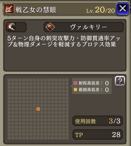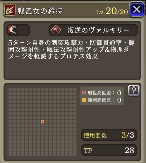 カウンタースティング ![]() | ヴァルキリー 物理攻撃による被ダメージ時に30%の確率で反撃&貫通&3ターン攻撃39%ダウン |