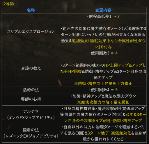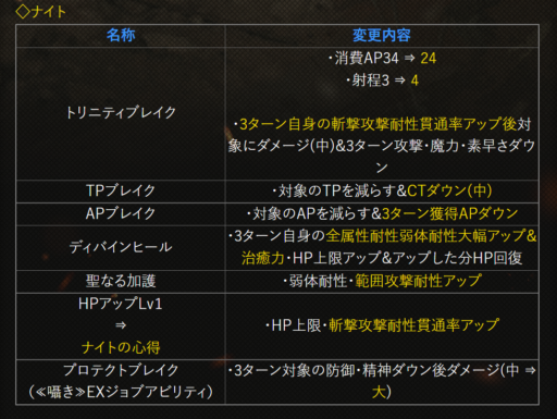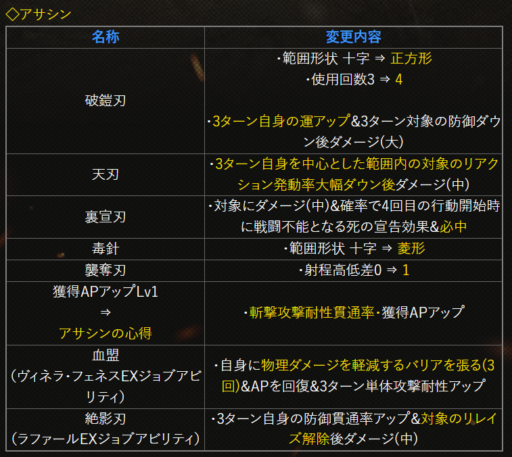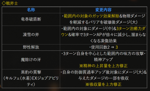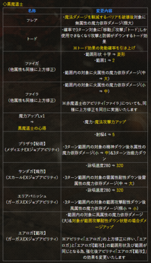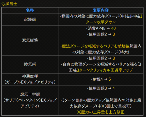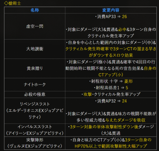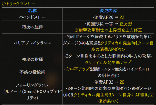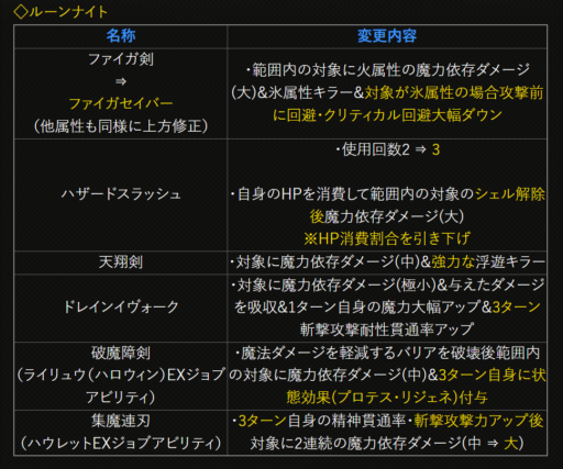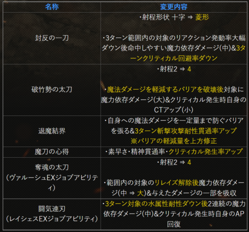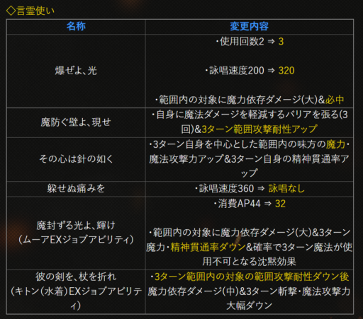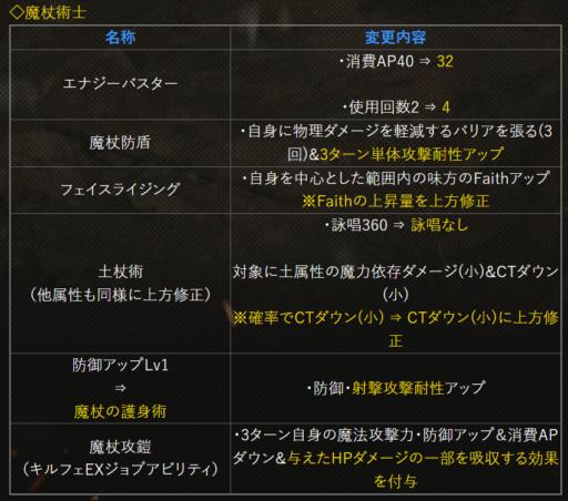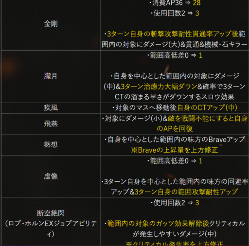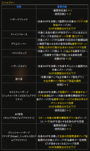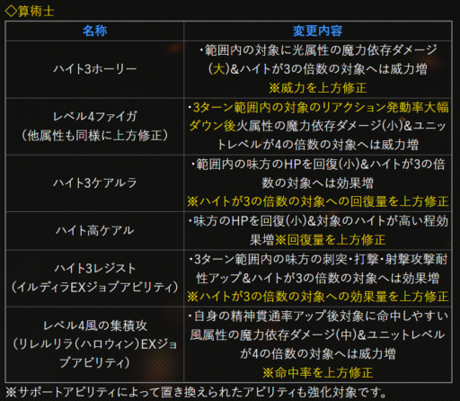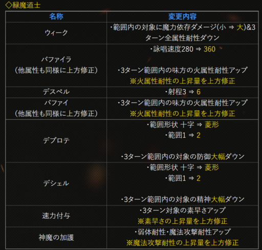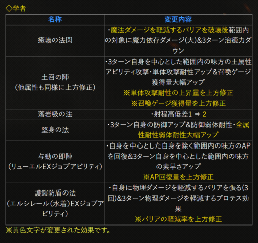 | 〇召の陣 | 単体耐性+15➜25に 召喚ゲージ獲得量+60➜100に |