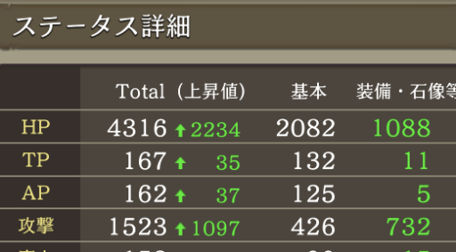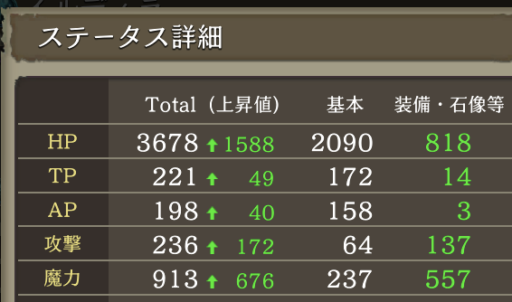 装備はもちろん、石像・マスタリー、マスターアビリティの加算やボードのプラス値など全ての加算値を含まない、素のステータスです