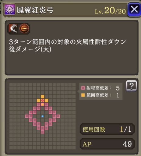 ![]() 火耐性38ダウン後ダメージ サポアビ「猛弓の弓術」の効果で 消費APは37になります |