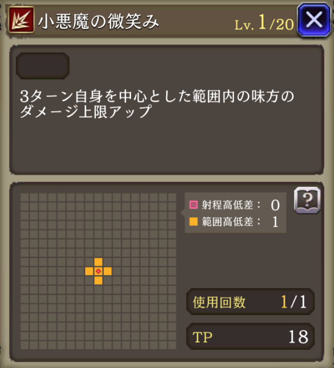 ![]() 小悪魔のドレス | 417 | 3ターン自身を中心とした範囲内の味方のダメージ上限+2000 | ![]() 小悪魔の微笑み | 服 | 小悪魔のドレス | 防具 | ルシア(ハロウィン) |