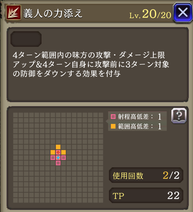 ![]() 義人の革帯 | 533 | 十字範囲内の味方に4ターン攻撃+40%&ダメージ上限+3000付与、自身に攻撃前防御ダウン20付与 | ![]() 義人の力添え | 装飾品 | 義人の革帯 | 装飾品 | 蛇魂の騎士オルドア |