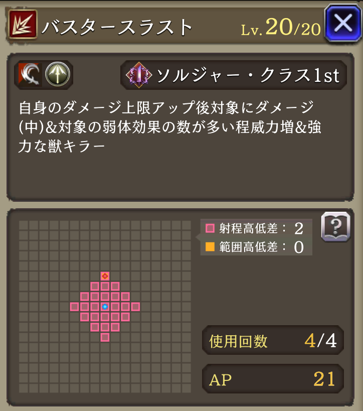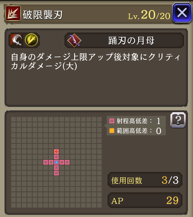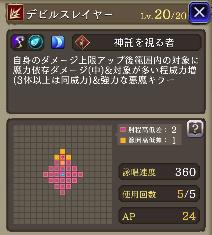 ![]() ダークアニマ | ダメージ上限2000 AP消費軽減25% 弱体抵抗率20 | 130 |