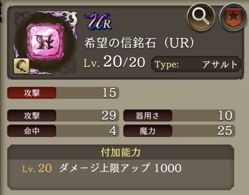 信銘石の 攻撃系(右列)・・・H:希望、O:克服、S:栄光 のいずれかで付加能力を選択可能(注意:最大1つ、かつ 武具特性とは重複しない)