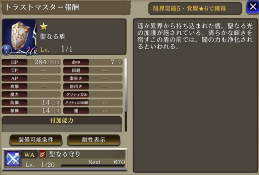 聖なる加護 | 弱体耐性+15、範囲耐性+12 |