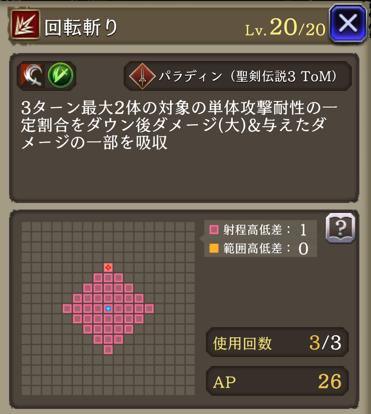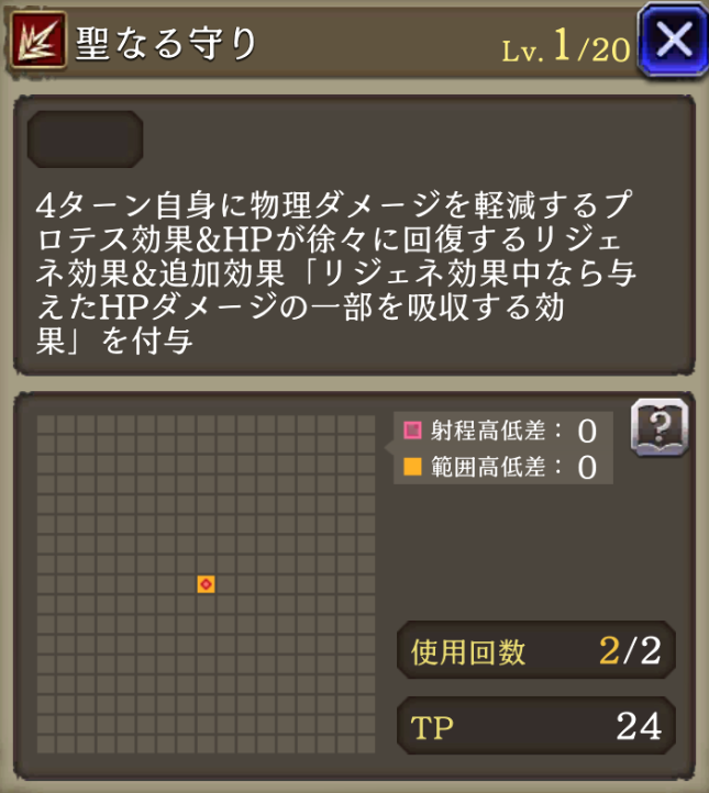 攻撃力アップ ↓ 攻撃力アップⅡ | 攻撃+24%、斬撃耐性貫通40 ↓ 攻撃+24%、斬撃耐性貫通40、距離3~6マス遠くなる程魔法被ダメージ軽減(最大) |
