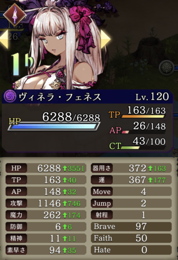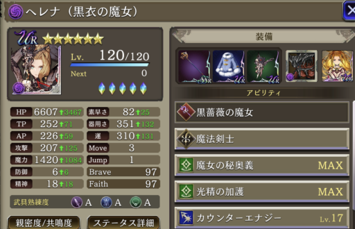 ![]() ヘレナステータス(装備+召喚獣+VC) 魔法攻撃65 (装備15 召喚獣15 VC35) 魔法攻撃耐性貫通20 闇アビ攻撃40 |