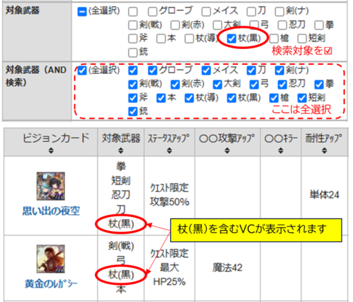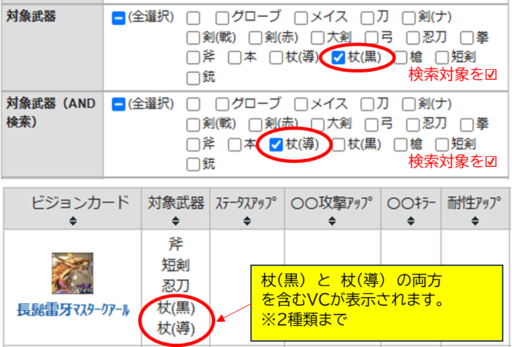 2つの対象武器を組み合わせ検索したい場合は以下のようにチェックを入れて下さい※2種類まで。複数チェックを入れた場合はOR条件になります
