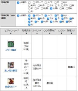 | ビジョンカード | 対象武器 | ステータスアップ | 〇〇攻撃アップ | 〇〇キラー | 耐性アップ | 命中/回避 | 特殊効果 | 対象属性 | 完凸追加能力 | 付与効果 | ビジョンアビリティ | 画像 | HP | TP | AP | 攻撃 | 魔力 | 防御 | 精神 | 器用 | 素早 | 運 | レア | Cost | キャラ限定効果 | 通常/ホロ | 入手手段 | 分類 | 検索用 | ビジョンマスタリー分類 | 対象武器2 | ID |