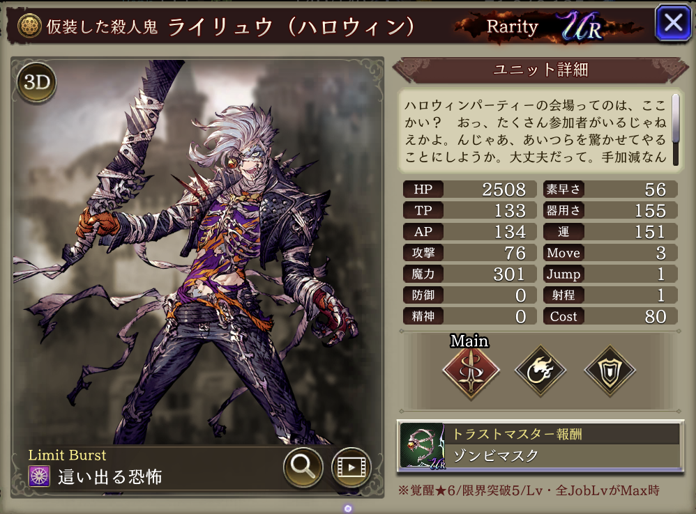 | ⇩MA3強化⇩ 味方の土属性ユニットのHP上限+10%・土属性アビリティ攻撃+15 自身の斬撃攻撃耐性貫通率+30、HP上限+10%、魔力+15%、防御+15、HP70%以下で消費AP-20%・自身が戦闘不能時3ターン的に物魔ダメージ低下20%&毒(係数0.67) |