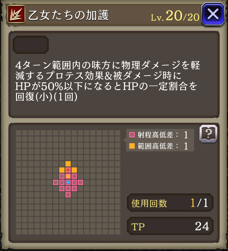 優しさを込めて ↓ 優しさが溢れて | 距離が遠くなる程被ダメ軽減(4マス以上、6マスまで効果増)、治癒力+15 ↓ 距離が遠くなる程被ダメ軽減(4マス以上、6マスまで効果増)、治癒力+15、魔法被ダメ軽減20% |