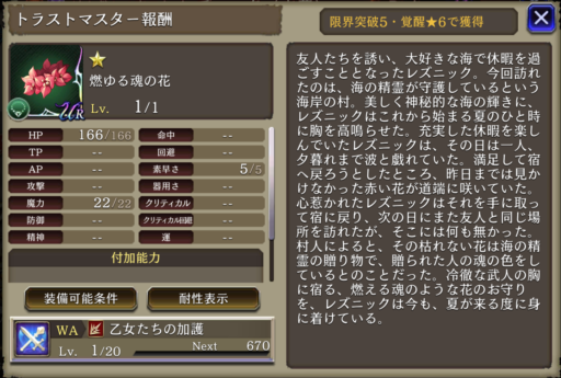砂城の防壁 ![]() | 常夏の乙女 斬撃、魔法タイプによる被ダメージ時に70%の確率でダメージを30%軽減 |