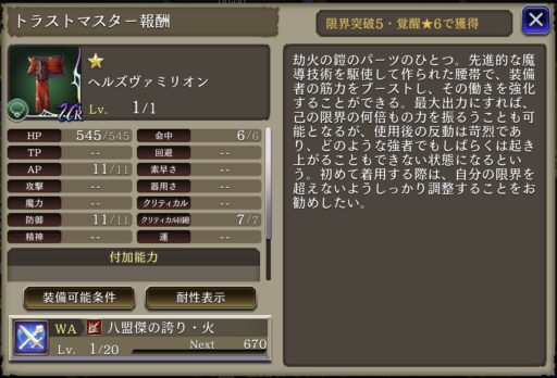 | ⇩MA2強化⇩ 味方の火属性ユニットのHP上限+10%・火属性アビリティ攻撃+15 自身の物理ダメージ軽減+10・獲得AP+30% 物理ダメージ+10%・治癒力+15・攻撃前に3T対象の弱体抵抗率25ダウン |