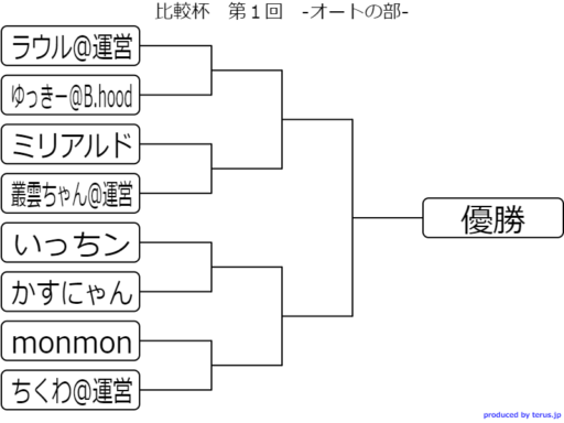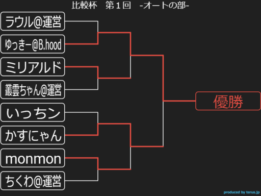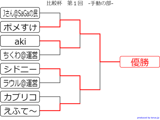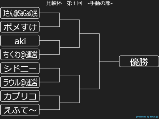 | ラウル@運営 ゆっきー@B.hood ミリアルド 叢雲ちゃん@運営 いっちン かすにゃん monmon ちくわ@運営 | Jさん@SaGaの民 ポメすけ aki ちくわ@運営 シドニー ラウル@運営 カプリコ えふて~ |