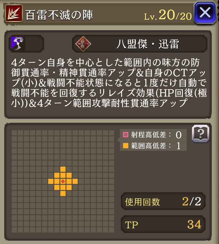 | 「万雷一統の陣」(Ex後) 遠い程被ダメ軽減10(2~5マス) AP自動回復5% |