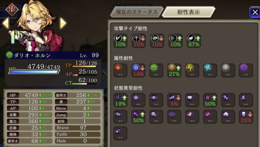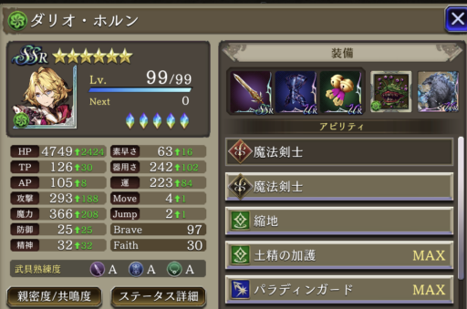 Lvは99ですが、Faith30で精神・魔法防御を盛った魔法タンクのダリオです。