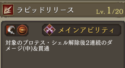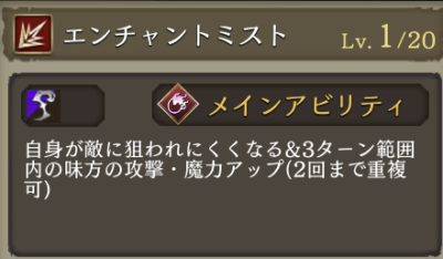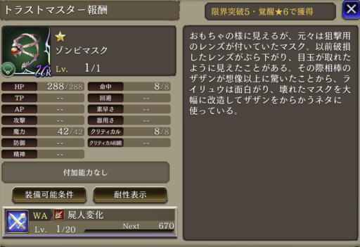 | Lv50 | 刺突攻撃+20 カミッロ限定効果⇩ (光アビリティ+15、精神+15、精神弱体耐性+100) |