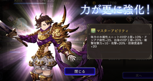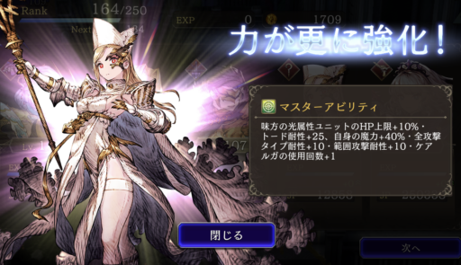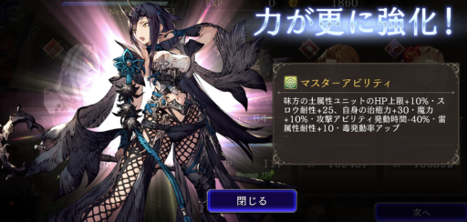 ![]() 治癒力+30、魔力+10% ⇩ ⇩ 味方の土属性ユニットのHP上限+10%・スロウ耐性+25、自身の治癒力+30、魔力+10%、攻撃アビリティ発動時間短縮400、雷耐性+10、毒付与係数0.2アップ |